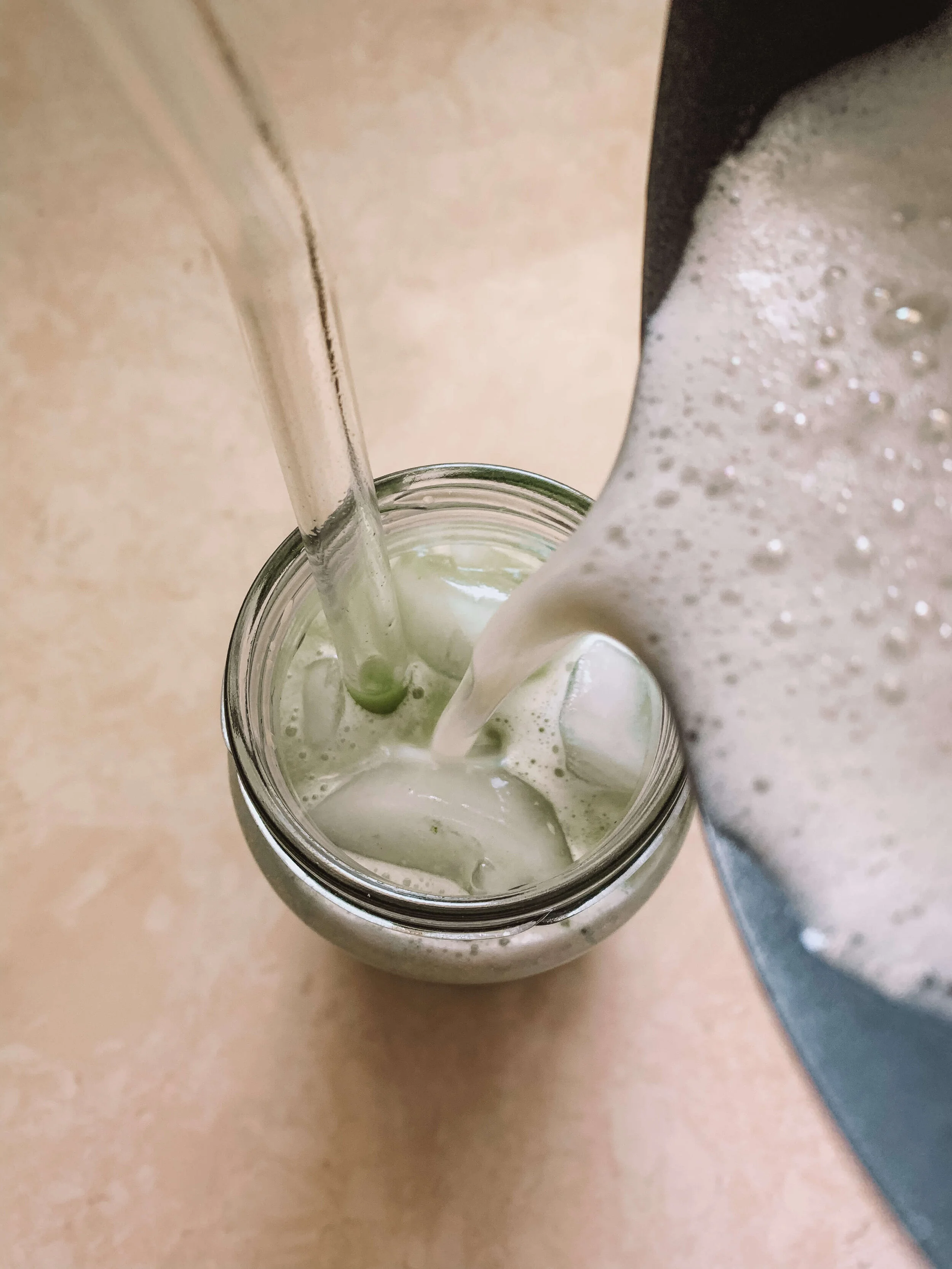 Now its time to add some ice. I normally fill the glass almost to the top with ice because I just like it that way but you can add however much you want, a lot of people go with no ice which is totally ok too! I then add oat milk to a milk frother on the cold setting. I use this one https://amzn.to/2CcnvTM. I love my milk frother because it can do hot or cold and works for cappuccinos and other beverages as well. This is another step that is not crucial and you can absolutely skip it if you don’t have a frother or don’t feel like buying it. You can simply just add oat milk to the match and sweetener mix and it’ll taste just as delicious. I enjoy the froth because it makes it feel like cafe quality. I love drinking my matcha with these glass reusable straws: https://amzn.to/2CcoBim
